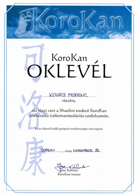 A kínai medicina úgy tartja, hogy az ízületi blokk (a roppanás elõtti állapot) gátolja az energiaáramlást a meridiánokban. Így érthetõ, hogy a manipulációk után nem csak helyi hatást érünk el, hanem különbözõ belszervi problémák is javulnak s az egész szervezetben javul az energia áramlása